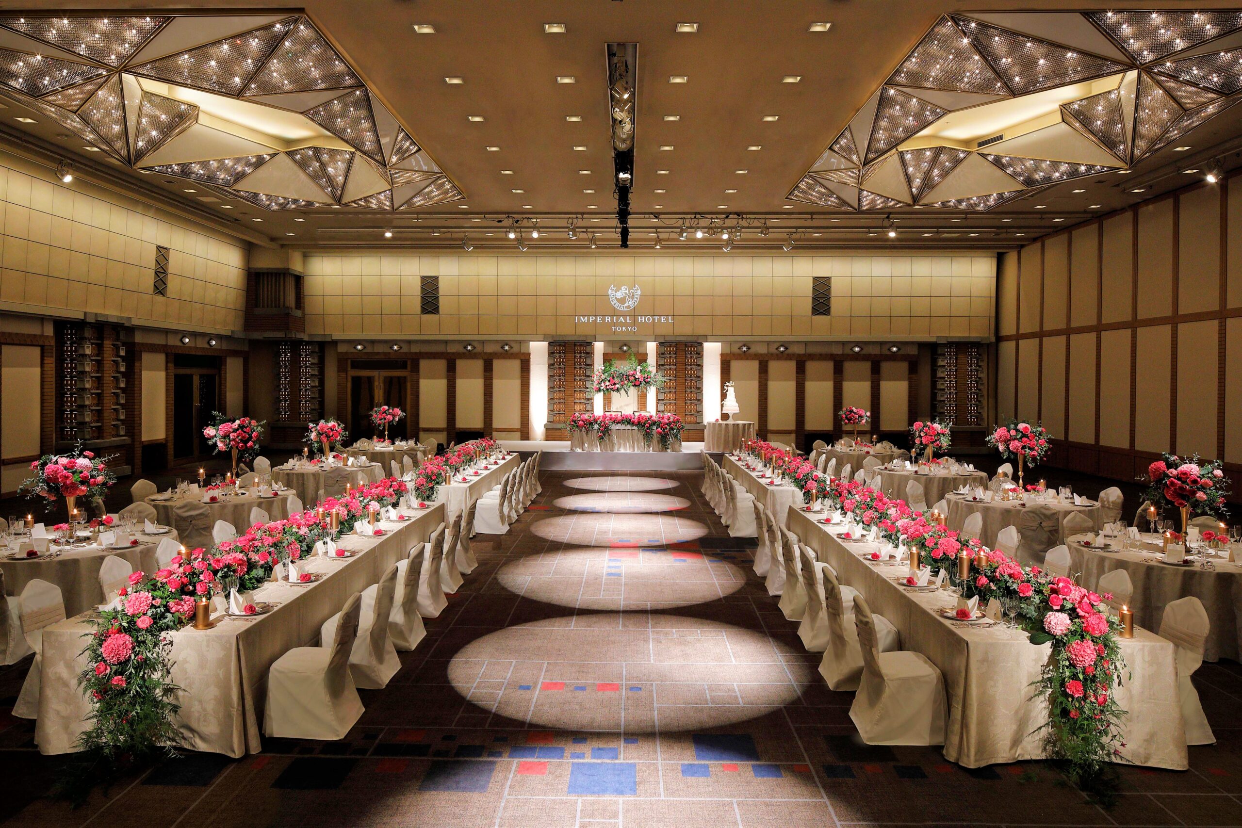 ホテルロゴ・バックフラワー・テラコッタなど高砂を照明で演出